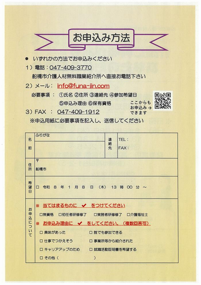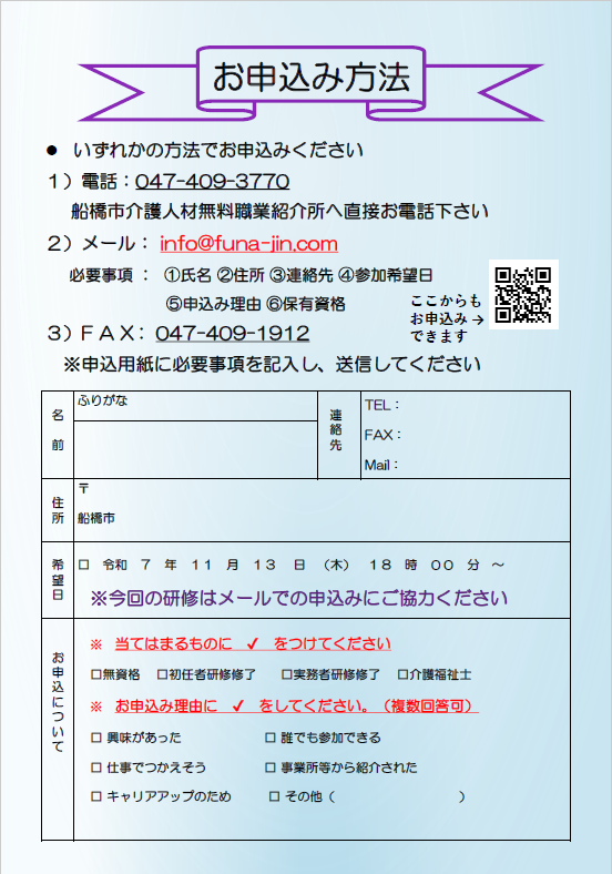 船橋市介護人材無料職業紹介所へお電話、Eメール、FAXにてお申込みください。