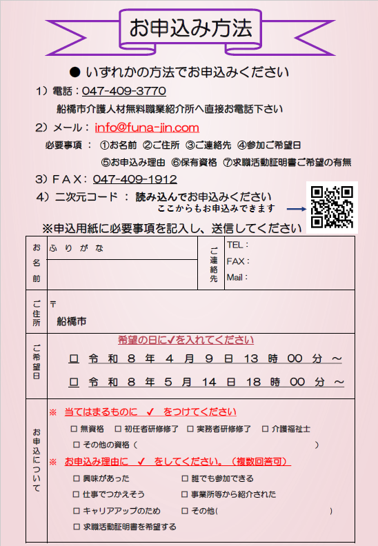 船橋市介護人材無料職業紹介所へお電話、Eメール、FAXにてお申込みください。