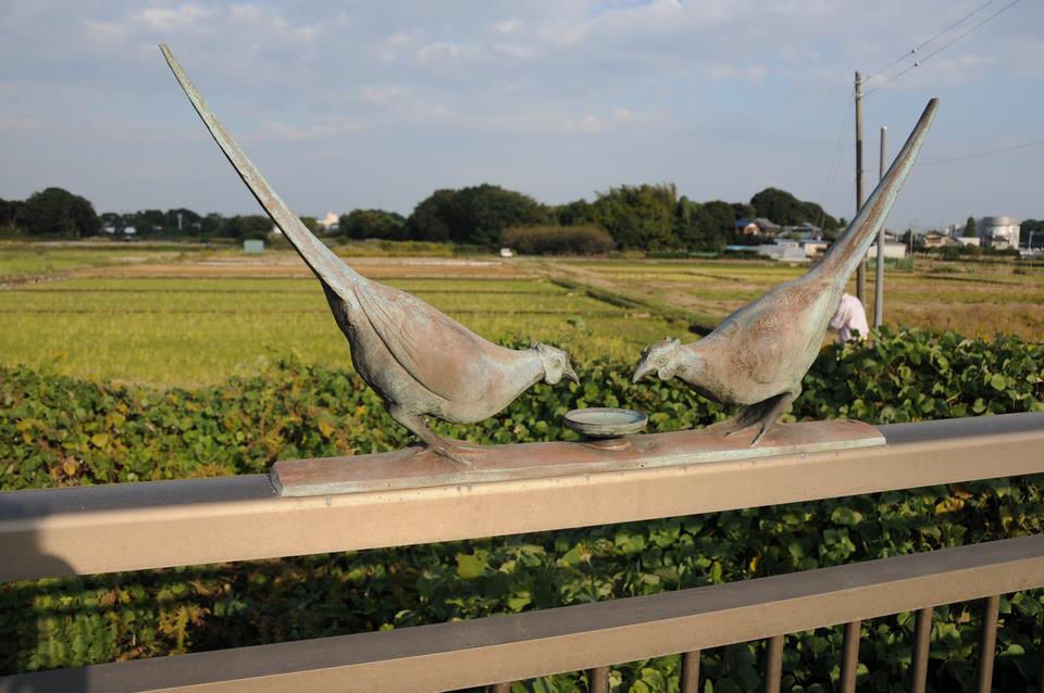 海老川13橋遊的終点。遠離船橋站周邊的喧囂,一片恬靜的景色。雕有兩隻恩恩愛愛啄食的山雞雕像。