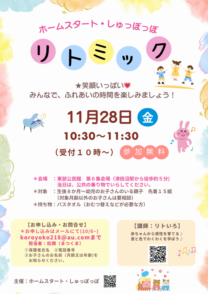 リトミックで笑顔いっぱい。親子ふれあいの時間を楽しみましょう♪ 対象生後8か月~幼児のお子さんのいる親子 参加費無料 持ち物バスタオル(おむつ替えなどが必要な方) 定員先着15組 (10月6日より受付、下記申し込み方法をご確認ください) 主催者ホームスタート・しゅっぽっぽ 問い合わせ先ホームスタート・しゅっぽっぽ |