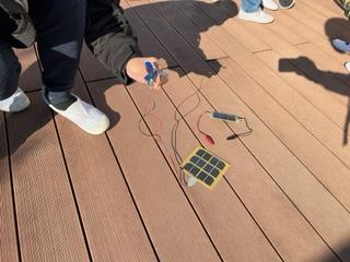 今日は天気も良く、屋上でソーラーパネルを使って実験を行いました。プロペラやオルゴールを太陽光発電機につなぐと、プロペラが回ったり音が流れたりして、太陽光でも発電することができることを学びました。