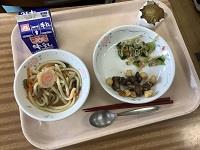 今日は山菜うどんが主食で出てきました。たくさんの具が入っていて、とてもおいしかったです。また、デザートのマフィンは、おかわりジャンケンで白熱していました。ジャンケンが終わった後に給食の先生が(おかわり分の)マフィンを持ってきてくれたとき、教室はすごく盛り上がっていました♪他の給食もすごくおいしかったです(^_^)