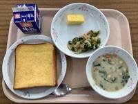 ※フレンチトーストは子供も大人も大好き!しかも、今回はオレンジフレンチトーストということで、風味付けにオレンジジュースが入っていたようです。さらに、両面にフレンチ液をたっぷりつけてあり、しっかりとしみ込んでやわらかいトーストは絶品!!食パンの切れ端もフレンチ液をつけて焼いたおかわりも各クラスに約10片ずつ届けてくださり…!調理員さんの愛情がこもったフレンチトーストが出された本日の給食は、まさに神回そのものでした!