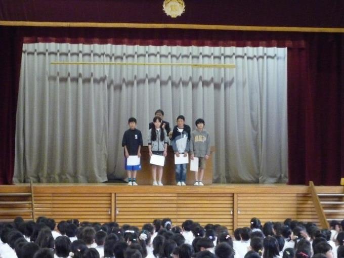 5月2日(月曜日)の朝に全校朝会を行いました。昨年度まで、定期的な全校朝会は行っていませんでしたが、今年度より、月1回程度行う予定です。今回の朝会の内容は、児童会による挨拶、校歌斉唱、市民陸上大会のメンバー紹介や表彰、善行表彰(挨拶をがんばっている子)及び校長講話でした。今後も子どもたちのモチベーションが上がる全校朝会を目指していきたいと思います。