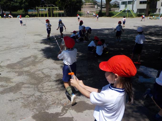マヨネーズの空き容器やペットボトルなどを使って、どうやったら水が遠くに飛ぶのか考えたり、友達と競ったりしながら楽しみました。