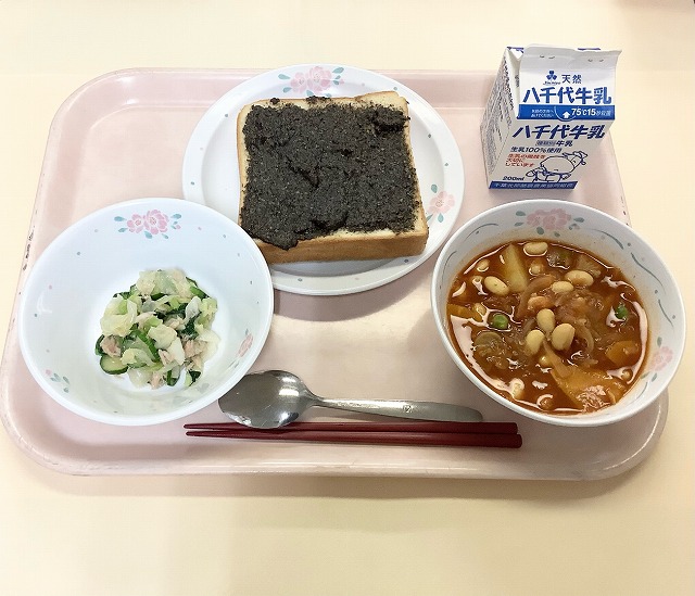 9月24日 牛乳 セサミトースト 豚肉と大豆のトマト煮 グリーンサラダ