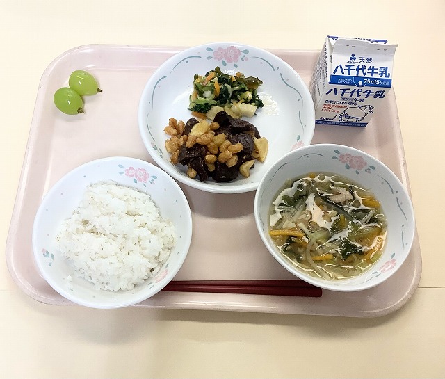 9月25日 牛乳 麦ご飯 レバーと大豆の揚げ煮 五色和え 沢煮椀 シャインマスカット