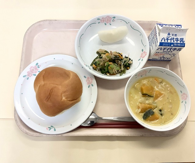 9月29日 牛乳 ハチミツパン パンプキンチャウダー 茎わかめのサラダ 梨(あきづき)