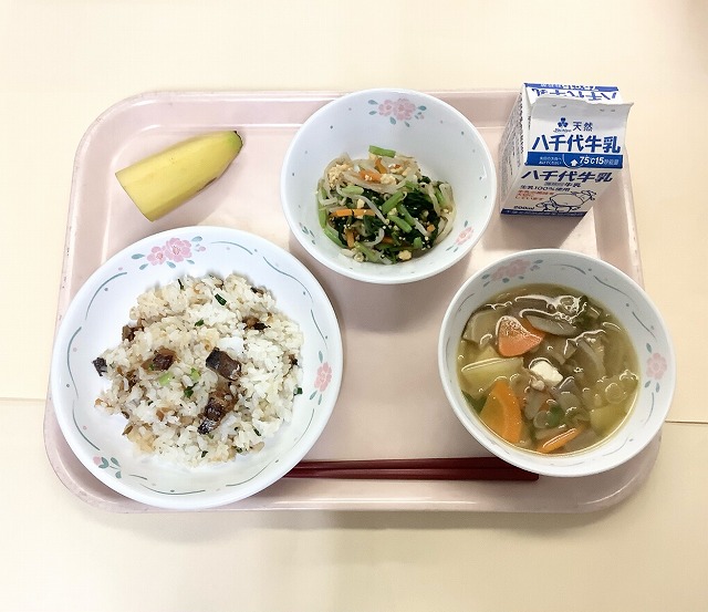 9月30日 牛乳 秋刀魚ご飯 みもざ和え けんちん汁 バナナ