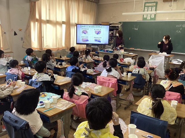 学校歯科医の先生をお招きして、歯の磨き方について教えていただきました。