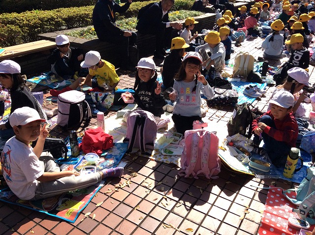 お昼ご飯は、大好きなお弁当。班のみんなで楽しく話しながら、おいしく食べました。