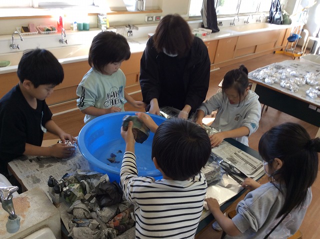 まず、1年生とおおぞら学級のみんなで、さつまいもをアルミホイルなどで包み準備をしました。
