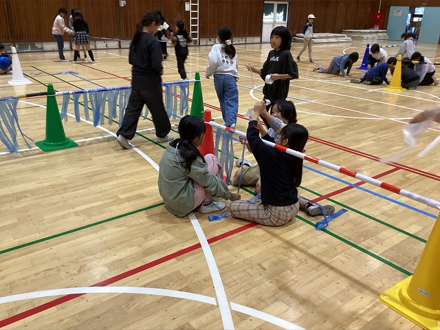 事前に段ボールでハンドラケットを作ったり、コートで使用するネットを作成したりと一から授業をみんなで作っていきました。