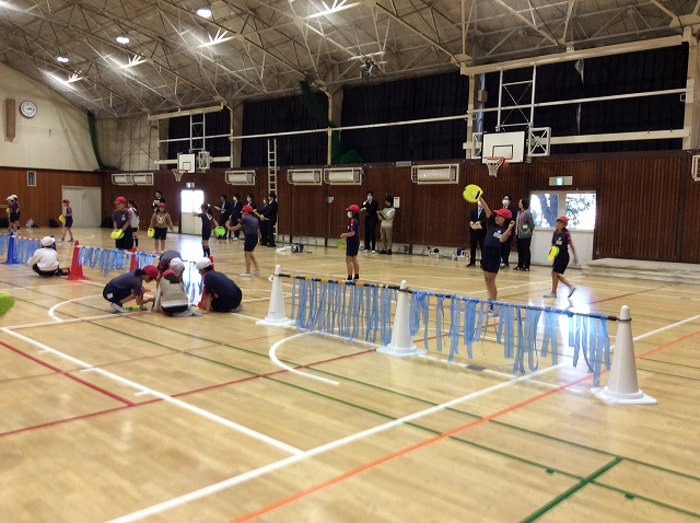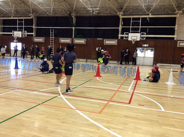 当日は、体育館に入ると参観に来た他校の先生方がたくさんいることに驚きと戸惑いの表情を浮かべていましたが、授業では準備や片付けを率先して行ったり互いにアドバイスをしたりしながら一生懸命取り組んでいました。