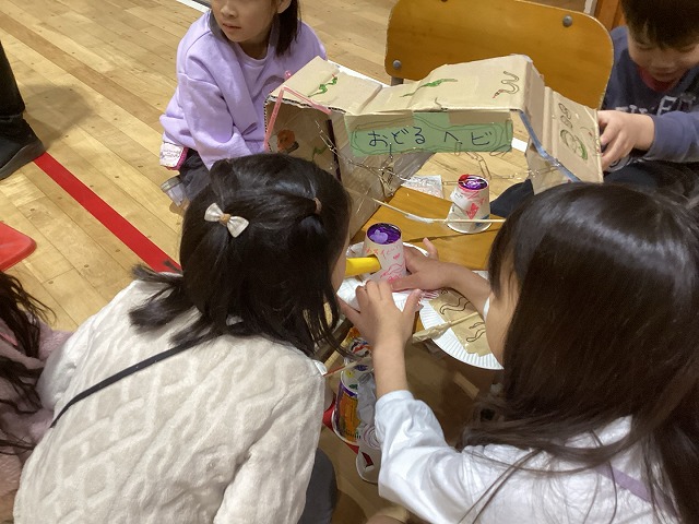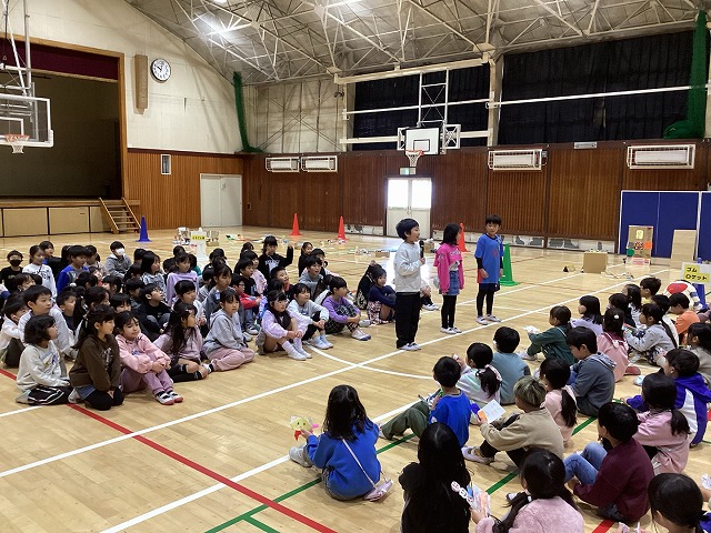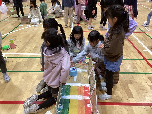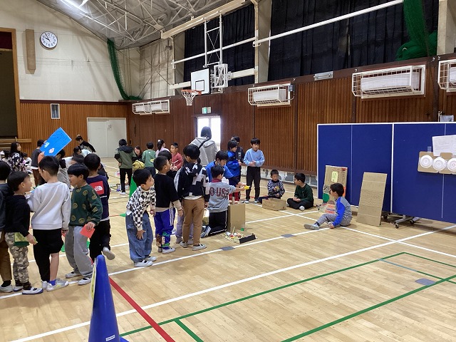 2年生が生活科の学習で作ったおもちゃを使って、体育館で1年生と一緒に遊ぶ会を行いました。