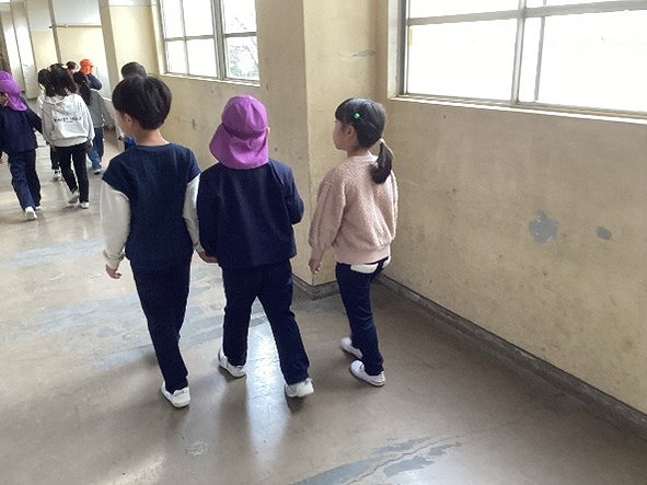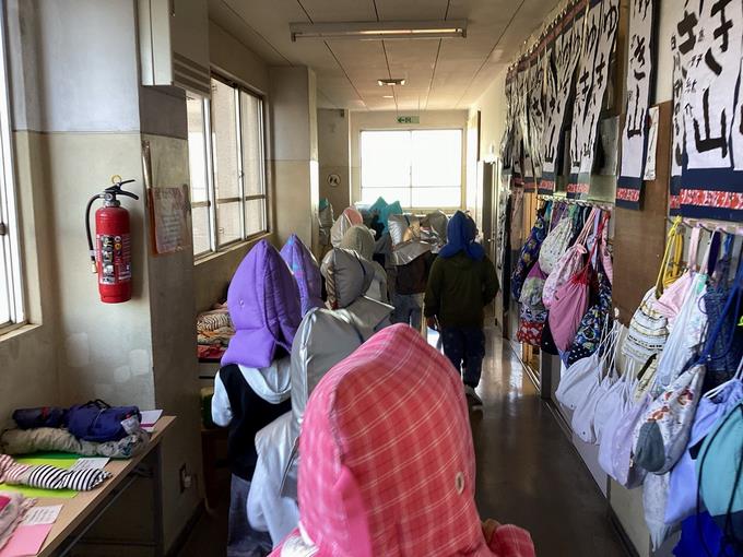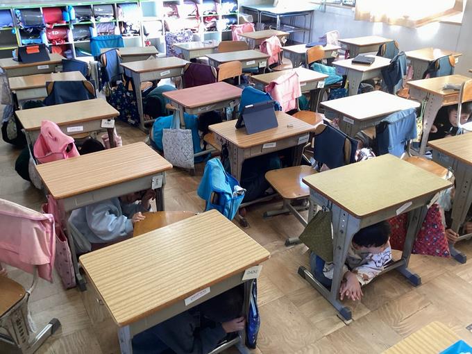 地震発生の合図とともに、子供たちは「まず低く、頭を守り、動かない」を意識し、身を守る行動をとることができました。