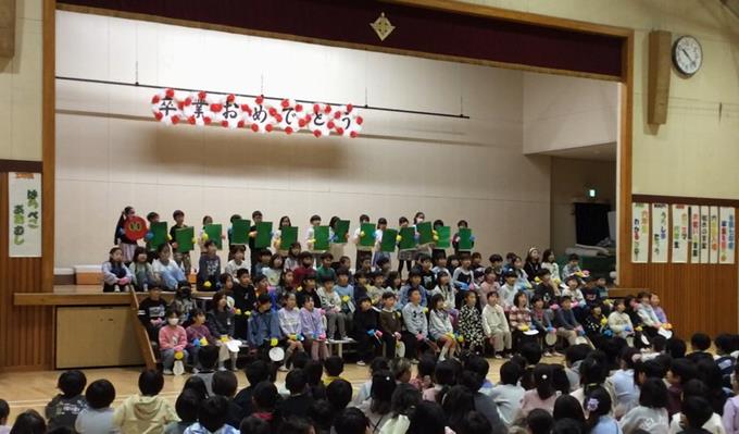 1年生は「六年生だ~いすき!」と、お誕生日の歌に合わせて元気いっぱいの歌声を届け、会場をあたたかな雰囲気で包みました。