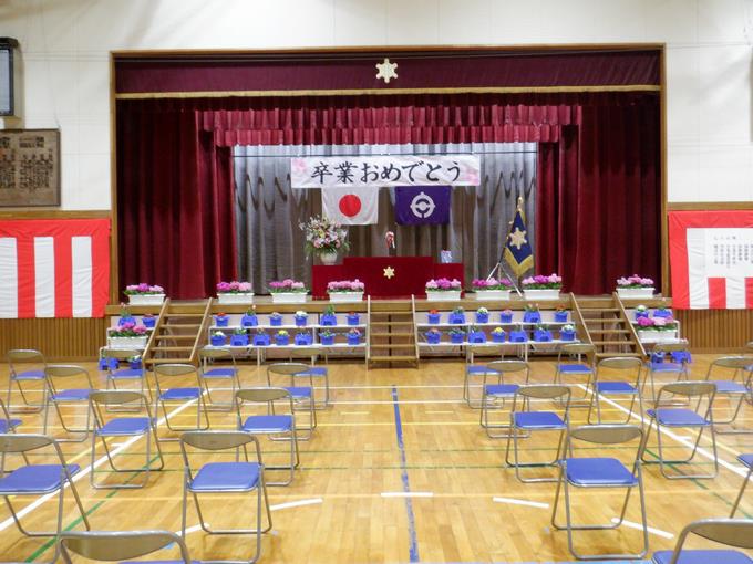 3月19日(木曜日)、今年度はコロナウィルスの流行により、3月から1ヶ月臨時休業となっておりました。集団が集まる場を自粛する中ではありましたが、今年度の卒業式は、感染予防を徹底的に行い、例年とは異なる形式で実施いたしました。30分という短い時間での実施、来賓の方々や在校生の参列をなくす、保護者の方は各家庭1名のみ参列、卒業生の証書の受け取りは代表者のみ、写真撮影以外ではマスク着用、椅子のアルコール消毒や参列者全員がマスク着用を義務づけるなど、沢山の制約がある卒業式となりました。入場の仕方や、呼名の仕方なども、本番直前に15分ほど練習するのみです。そんな中でも、子ども達は六年担任の最後の指導をしっかりと聞き取り、本番を堂々と迎えることができました。このような事態にも柔軟に対応してくれた卒業生達には、中学生になってもより多くの活躍を見せてくれることを期待しております。