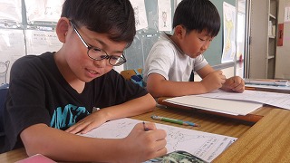 習字では「草原」の練習をしました。5年生の習字は教頭先生が担当しています。「原」の文字を構成するパーツを中と外に関係づけて書いていきます。練習なので、半紙を折ってバランスを意識して練習することができたようです。しんと集中して書くことで、注意すべきところに意識を向けることができました。「小さくなってしまった」「中心が揃った」など、子供たちからも呟きがあり、振り返りができていました。