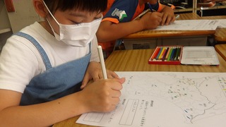 生活科では、2年生が計画して1年生を学校探検の案内をしてあげました。校舎内、校庭を手をつないで案内している様子に、2年生の頼もしさを感じました。学校マップに探検した教室の色塗りをします。教室に戻ると、クイズを出したり、折り紙を一緒に折ったりして楽しいコミュニケーションをとっていました。