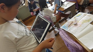 図工「ゆめいろランプ」。光を透過する素材を組み合わせて、ランプを作ります。事前にタブレットを使い、ランプのデザインを考えています。タブレットの着色機能や細かく書き入れられる機能を生かし、しっかりと構想を立てていました。黙々と取り組む子が多く、制作に没頭しているようです。ランプを完成させ、灯すのが楽しみですね。