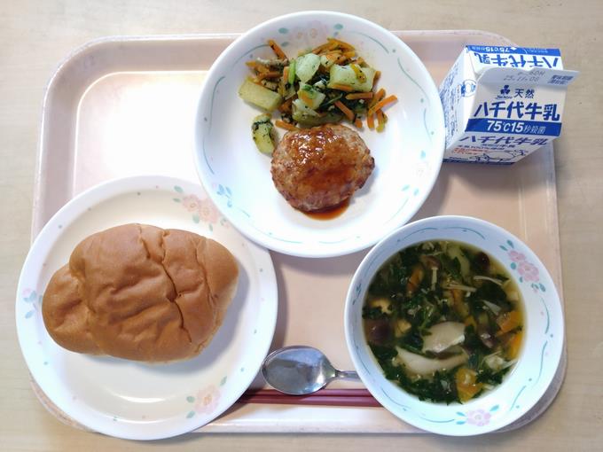 テーブルロール・手作りハンバーグ・小松菜ベーコンポテトソテー・きのことほうれん草のスープ