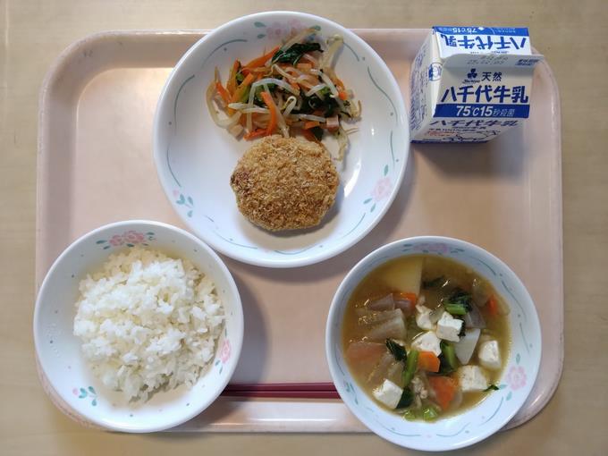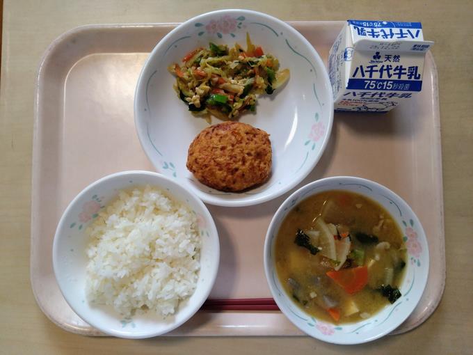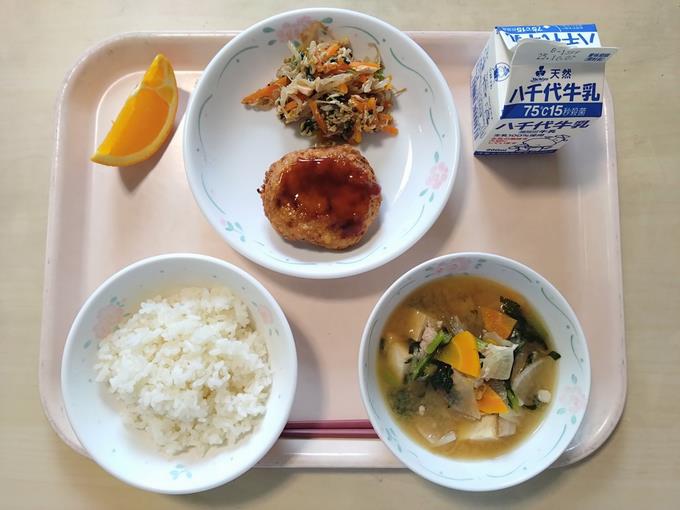 ご飯・キャベツメンチ・小松菜のツナ和え・けんちん汁・清見オレンジ