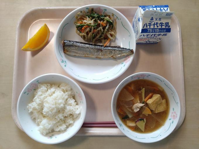 ご飯・さんまの塩焼き・ごま酢和え・さつま汁・オレンジ