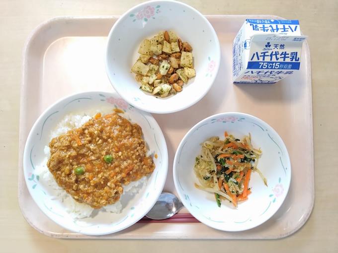 ごはん・いわしのカレー風味揚げ・くきわかめの和え物・けんちん汁・月見団子