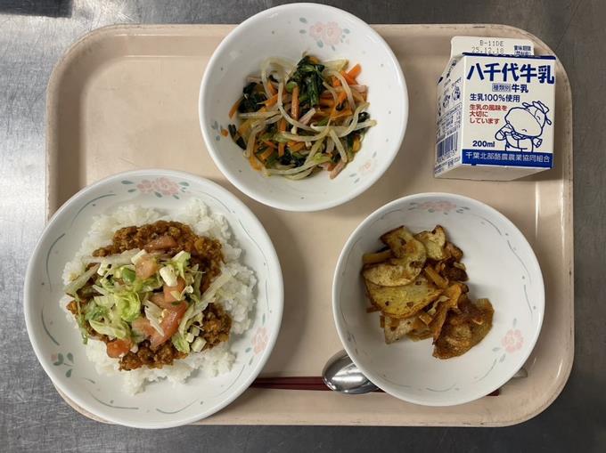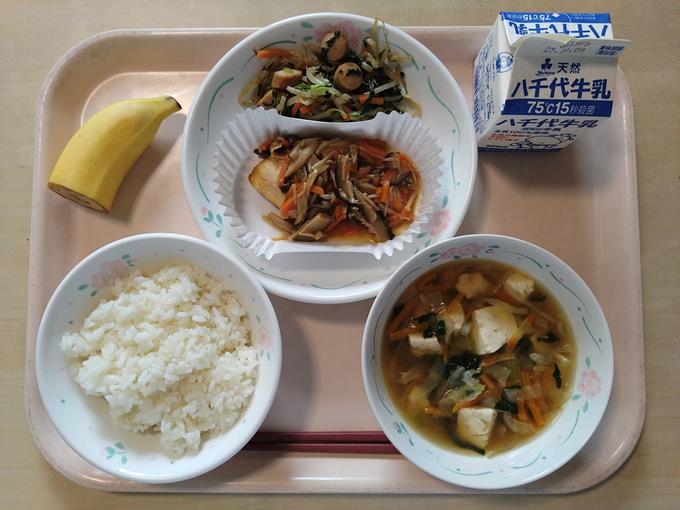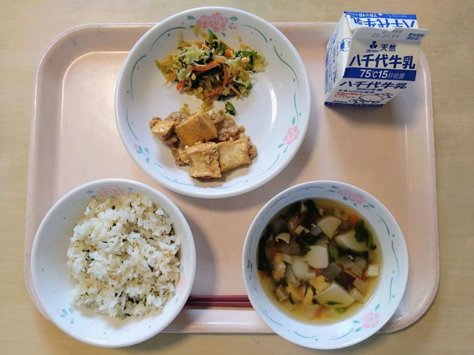 わかめごはん・生揚げの肉みそがけ・千草和え・ざくざく汁(福島県の具だくさん汁)