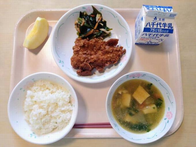 ごはん・とり肉のクラッカー揚げ・海そうサラダ・けんちん汁・りんご