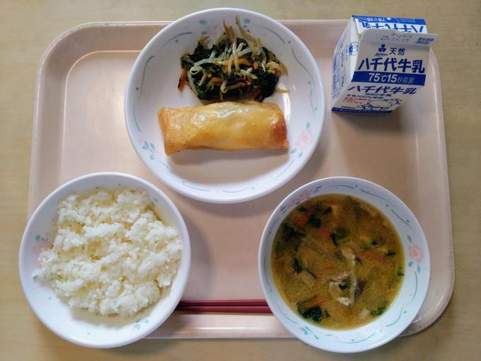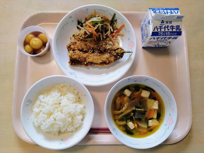 ごはん・めひかりのから揚げ・小松菜のごま和え・八宝みそ汁・ホワイトゼリー