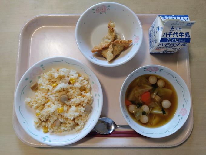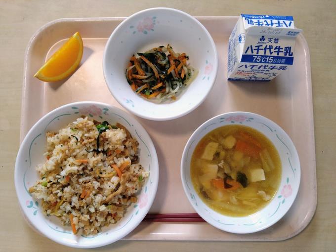 キャロットツナピラフ・レバーとポテトのカレー揚げ・鶏肉と生揚げのスープ・オレンジ