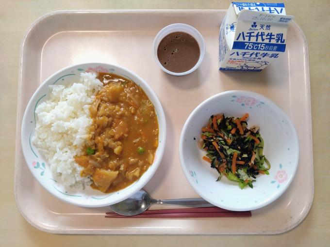 チキンカレーライス・ひじきとレタスのサラダ・豆乳ココアプリン