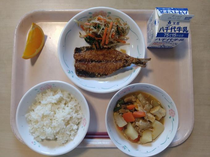 ご飯・いわしのかりん揚げ・生揚げと大根のそぼろ煮・小松菜のごま和え・オレンジ