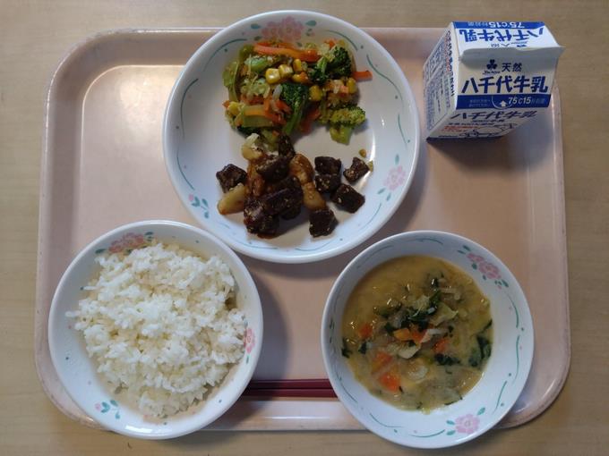 ごはん・豚肉のみそ照り焼き・小松菜とえのきの海苔酢和え・鶏肉とじゃが芋の煮物・オレンジ
