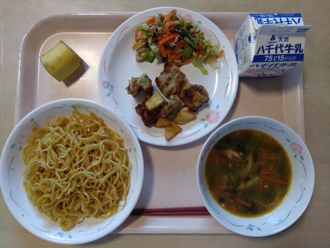 野菜味噌ラーメン・じゃがいもと竹輪の磯辺揚げ・豚肉のレモン風味サラダ・バナナ