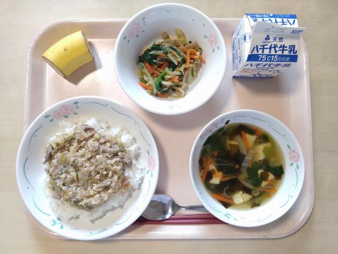 ごはん・鮭のチャンチャン焼き・茎わかめの和え物・卵スープ・バナナ
