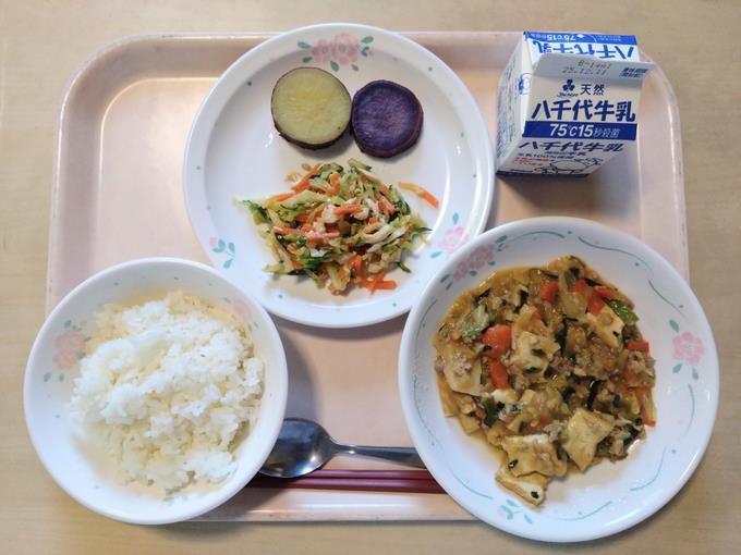 ご飯・厚揚げのピリ辛炒め・ちゅうかチキンサラダ・さつまいも