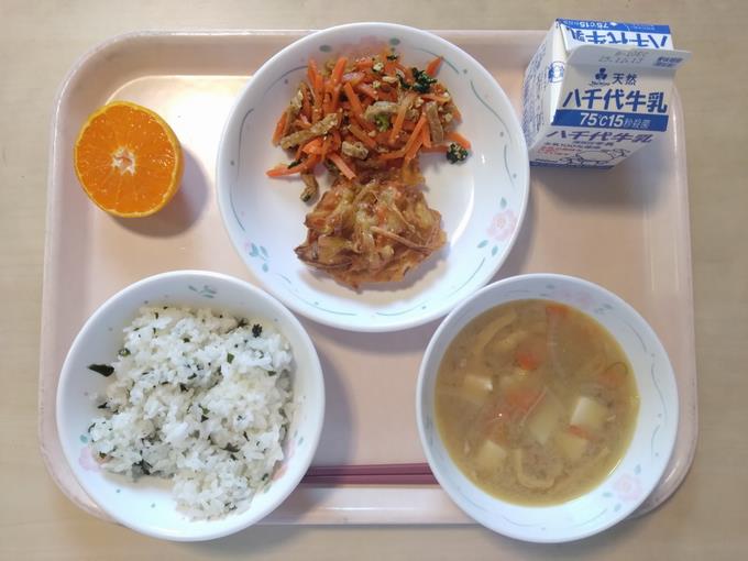 わかめご飯・かきあげ・にんじんきつねしりしり・お事汁・花みかん