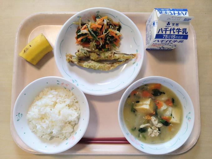 ご飯・ししゃもの磯辺揚げ・からし和え・すいとん・バナナ