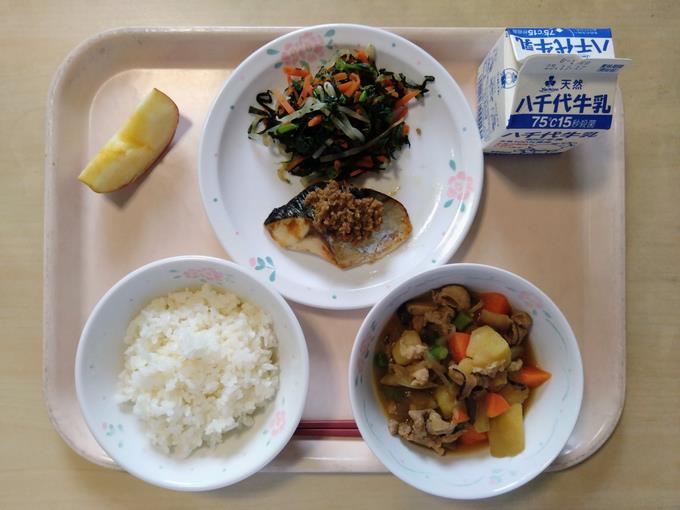 ご飯・さばのごまだれやき・肉じゃが・いそか和え・りんご