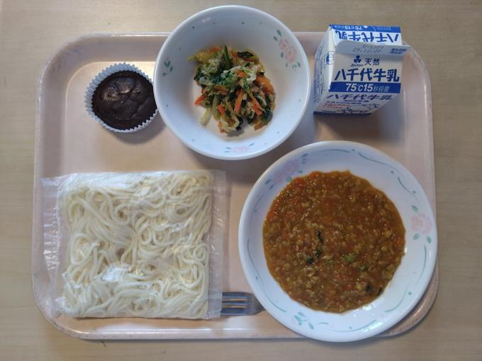 ソフト麺 肉味噌ソース・キャベツとじゃこのサラダ・豆乳バナナマフィン