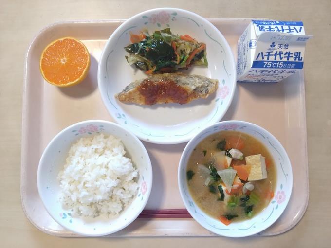ご飯・揚げ魚の甘酢あんかけ・海藻のサラダ・さつま汁・花みかん
