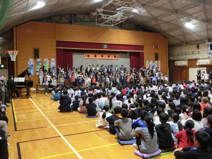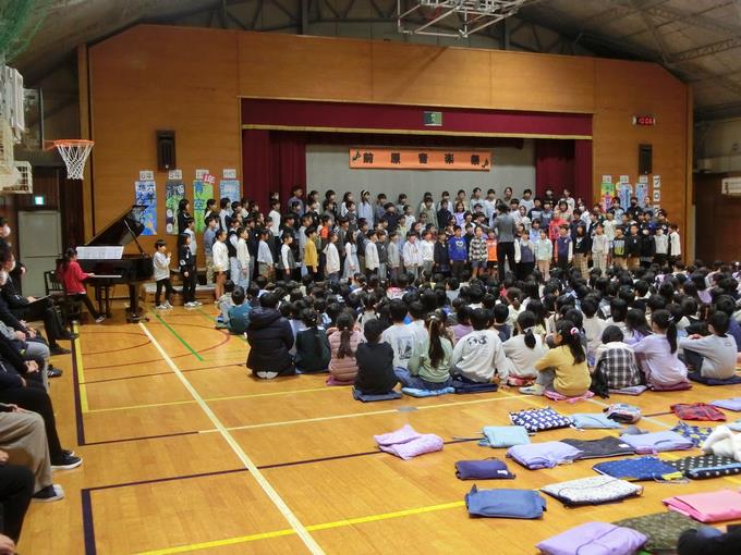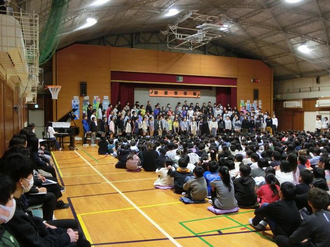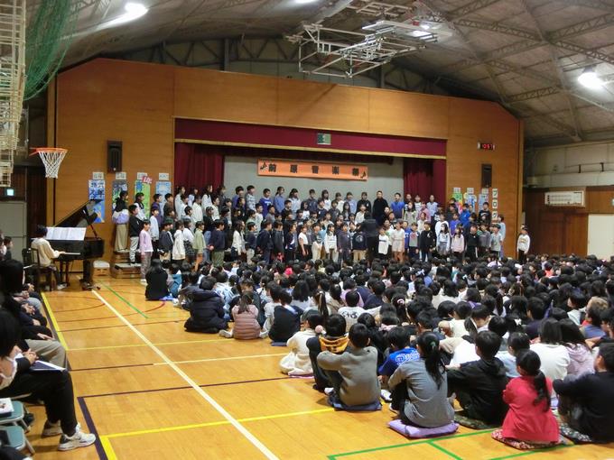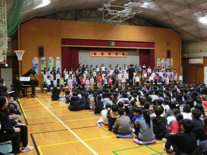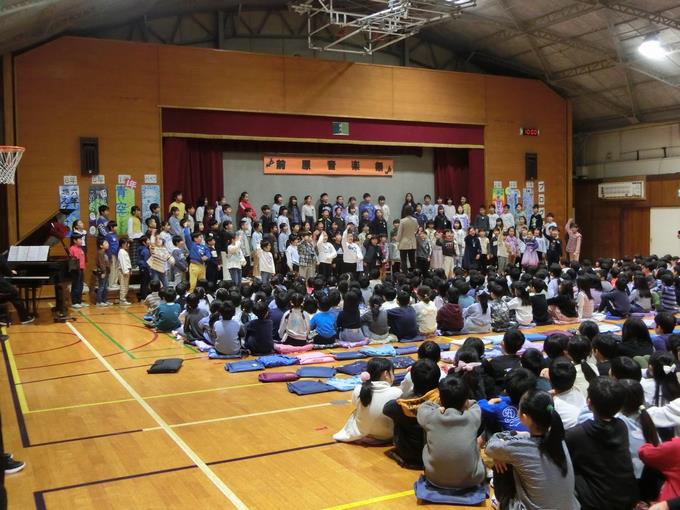 11月28日(金曜日)、音楽祭が開かれました。最初に全体合唱「歌よありがとう」を元気よく歌いました。その後1年生から6年生が、学年ごとに練習の成果を精一杯発揮し、体育館に素敵な歌声を響かせていました。また、5・6年音楽祭の中では、有志による「あおい天使」の合唱もありました。