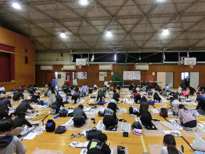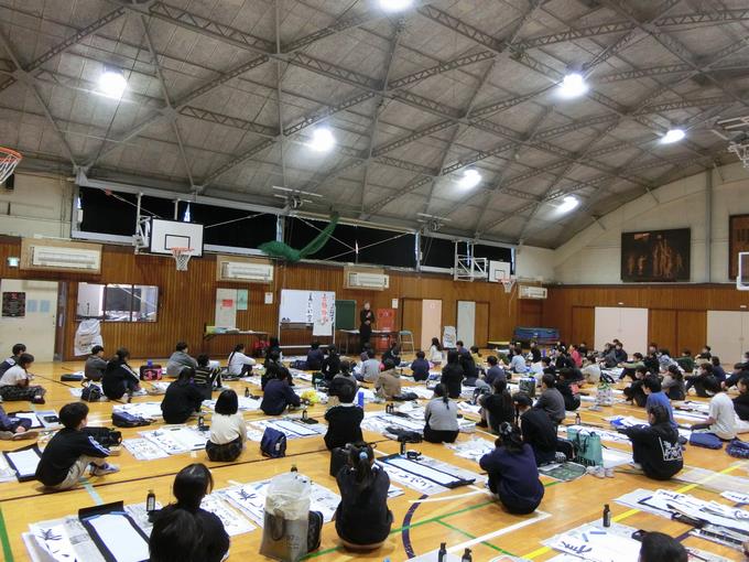 12月16日に、5・6年生が、17日に3・4年生が席書会に向けて書初めの練習を行いました。先週までは各教室で、書初めで書く文字を一文字ずつ、丁寧に練習しました。そして今週は学年ごとに、船橋市内で校長先生をされていた国語科の方を講師に招いて体育館に集まり指導をしていただきました。子どもたちは、お手本をよく見て集中して書いている姿がたくさん見られました。1月の席書会が楽しみです。