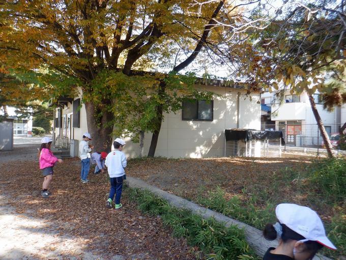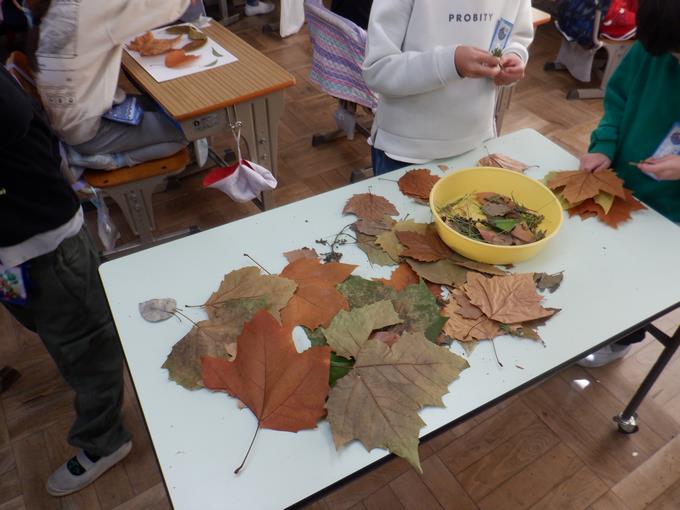 1年生は生活科で「あきとなかよし」を学習しています。秋のものを考えてビンゴをしたり、落ち葉やどんぐりを使って作品をつくったりしました。子供たちは秋が大好きで、「寒いなあ」と言いながらもたくさんの秋のものを見つけ、楽しそうに学習しています。今回は落ち葉を拾って、模様づくりに挑戦しました。