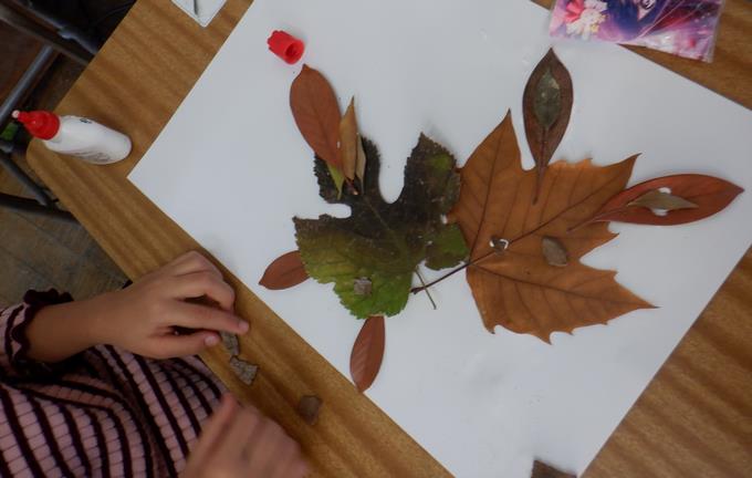 いろいろな大きさ・色・種類の落ち葉をたくさん集め、ボンドを使って上手に画用紙に貼ることができました。作りたいもののイメージをもって、それを上手に表現する子供たちの想像力の素晴らしさに感心しました。
