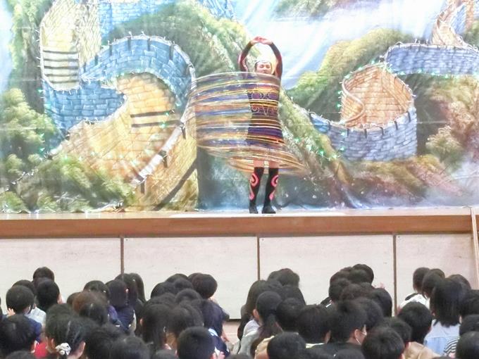 フラフープ芸。1個を回すだけでもコツが必要なのに、何個も同時の回します。最後には50個同時に回すという神業。すごすぎて、峰っ子たちはもう夢中で見ています。拍手が続きます。
