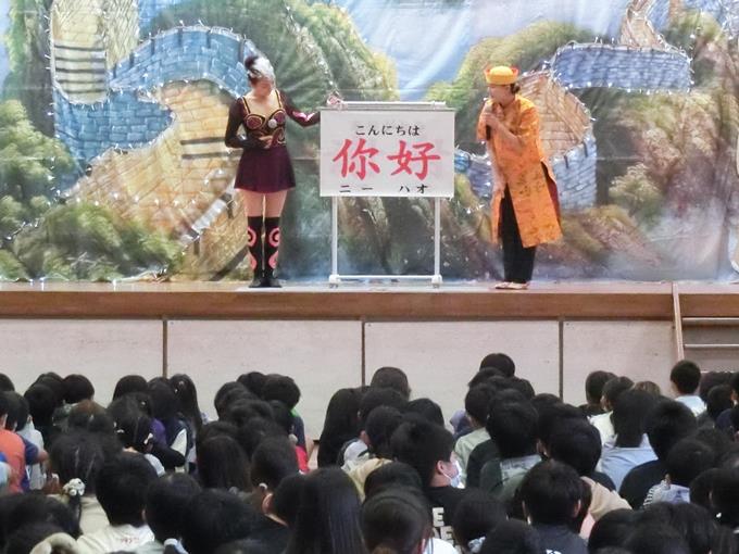ワンポイント中国語講座。このコーナーでは、みんなで中国語の発音を教えてもらい、声を出して楽しみました。先生は「老师(lǎoshī )」と言って、何でも知っている人だそうです。